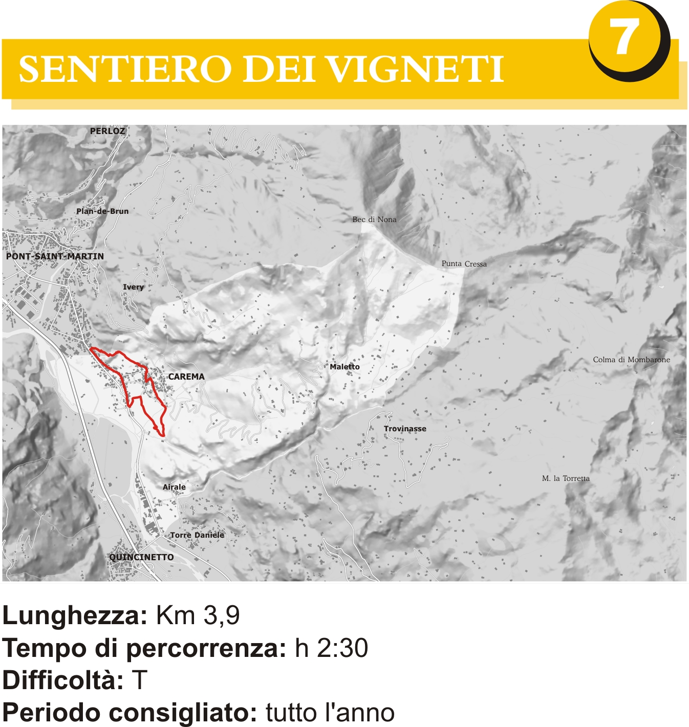 Il percorso consiste in un itinerario ad anello, con una lunghezza complessiva di 4 km ed un dislivello in salita di 100 m, che utilizza alcuni dei tanti sentieri di Carema e permette di visitare in tutti i periodi dell’anno le principali e più importanti emergenze del paese.