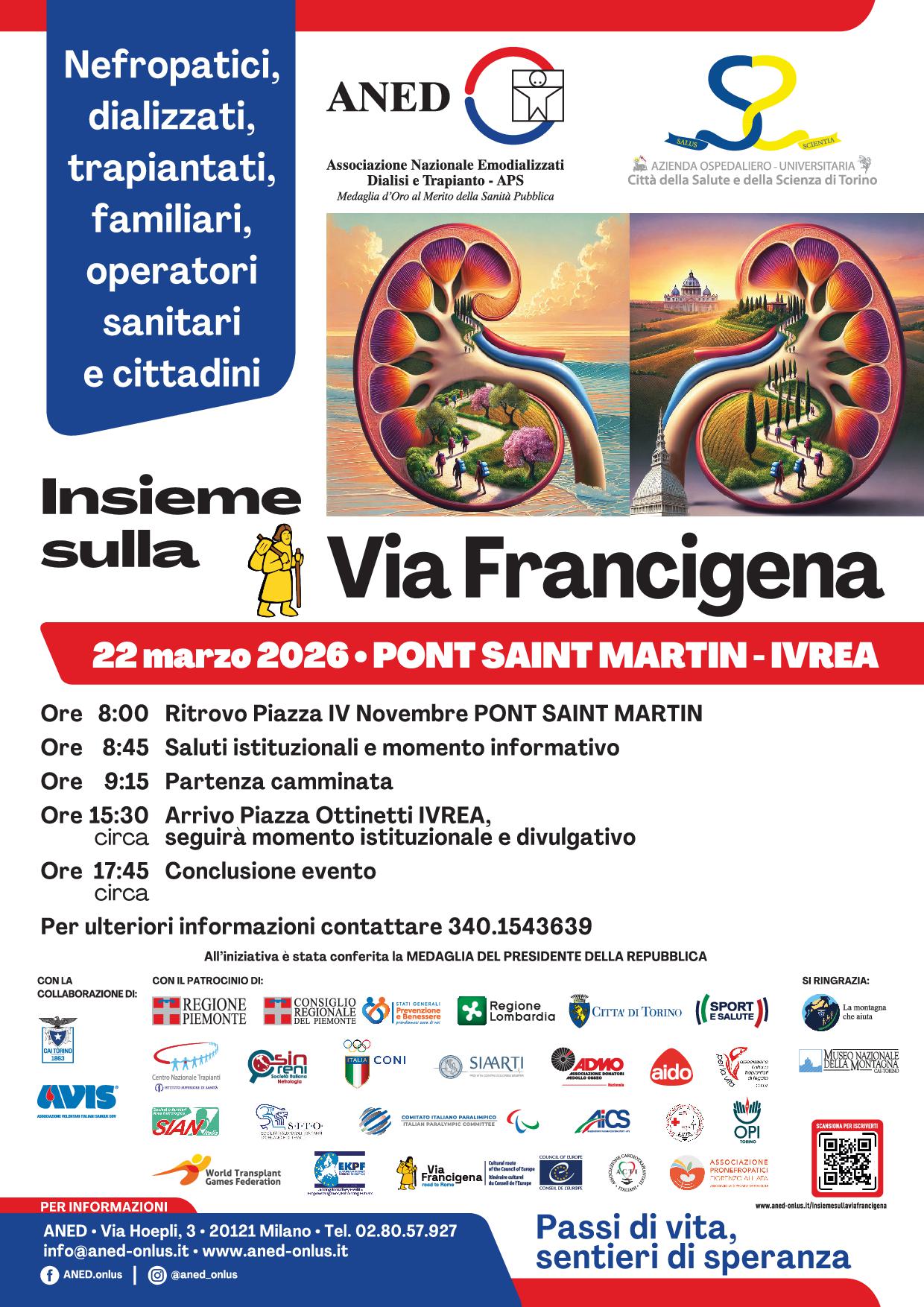 L'evento è una camminata non agonistica, denominata: INSIEME SULLA VIA FRANCIGENA - Cammino per la salute, l'inclusione e la speranza, che si svolgerà domenica 22 marzo 2026 sul tratto Pont-Saint-Martin - Ivrea con partenza alle ore 8.00 e arrivo alle ore 17.45 circa (ved. locandina).